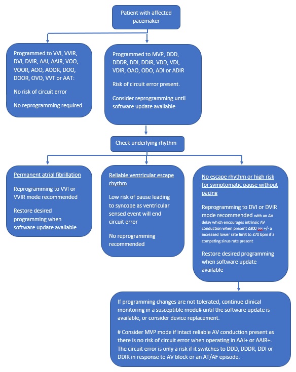 Each patient needs to be considered individually. The ANZDACC and Medtronic recommends programming to a non-susceptible pacing mode as the primary mitigation for patients implanted with an affected device until the software update has been installed. Specific patient risk assessment and programming recommendations are outlined below and provided in Appendix A.